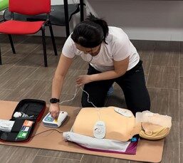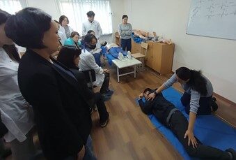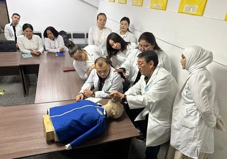 Assistant Zhailoobaeva A.T. conducts a practical lesson on the topic "BLS - basic cardiopulmonary resuscitation; ALS – Advanced Cardiopulmonary Resuscitation" with assistants of clinical departments of KSMA and clinical residents.