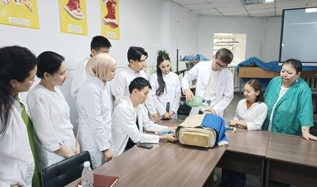 Assistant Nazarbekov D.K. conducts a lesson on the topic "Resuscitation in acute respiratory failure" with 6th year students of the Faculty of General Medicine