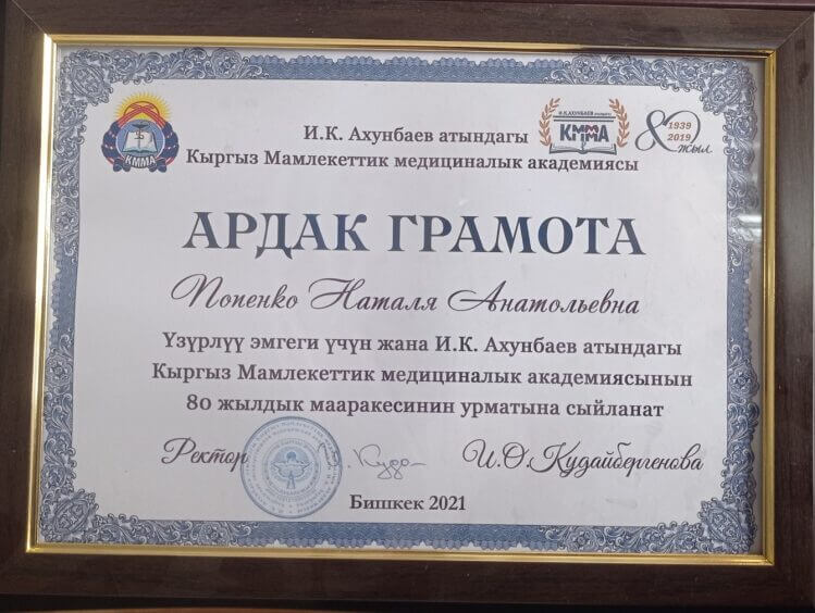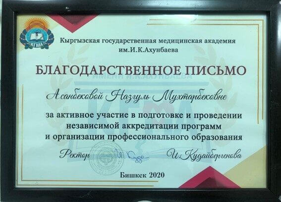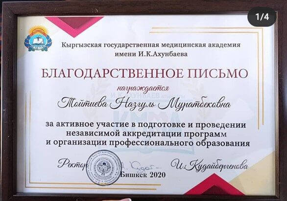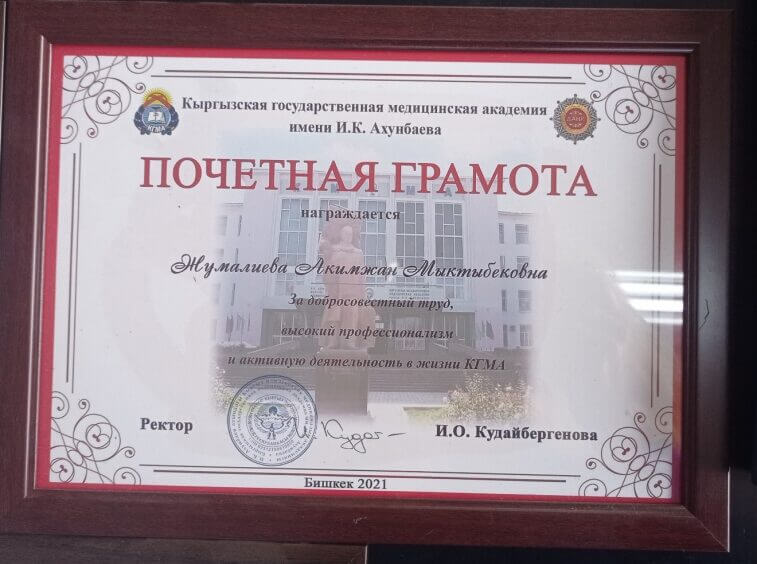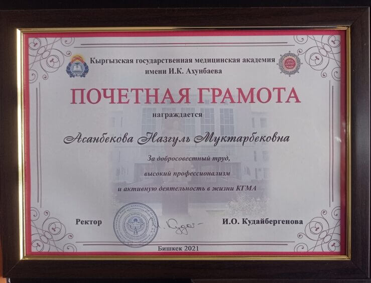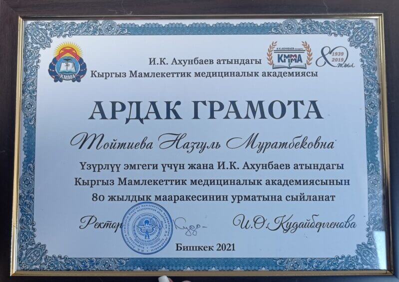 Director of the medical school, honorary worker of the Ministry of Education and Science of the Kyrgyz Republic, honorary worker of the Ministry of Health of the Kyrgyz Republic,