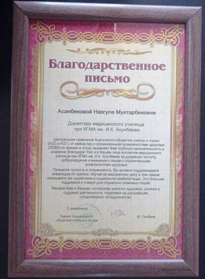 Medical College of the KSMA was opened in 1999 by a Decree of the Government of the Kyrgyz Republic “On Approving the National Program for the Support of Persons with Disabilities”, dated June 29, 1999, which was issued at the request of the representative of the Society of the Blind and Deaf of the Kyrgyz Republic. Based on the Decree the Rector of the KSMA allowed opening a medical college in KSMA for visually impaired persons who have been training as a massage therapist for the period of 1 year.