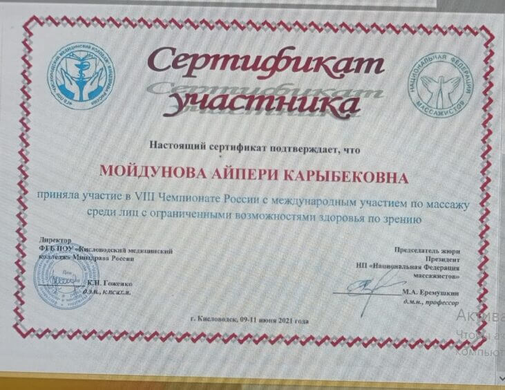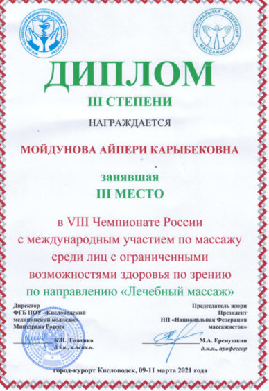 Moidunova Aiperi Karybekovna took part in the VIII Russian Championship in Massage with international participation among people with visual impairments in the field of "Therapeutic massage" and took III place