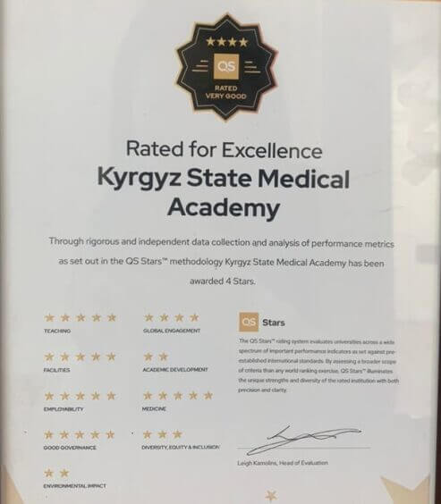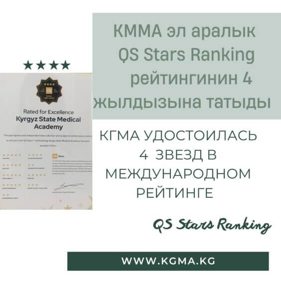 I.K.Akhunbaev Kyrgyz State Medical Academy is pleased to announce a new achievement, having been awarded the QS Stars certificate with four stars, presented by the World's leading organization QS Quacquarelli Symonds.