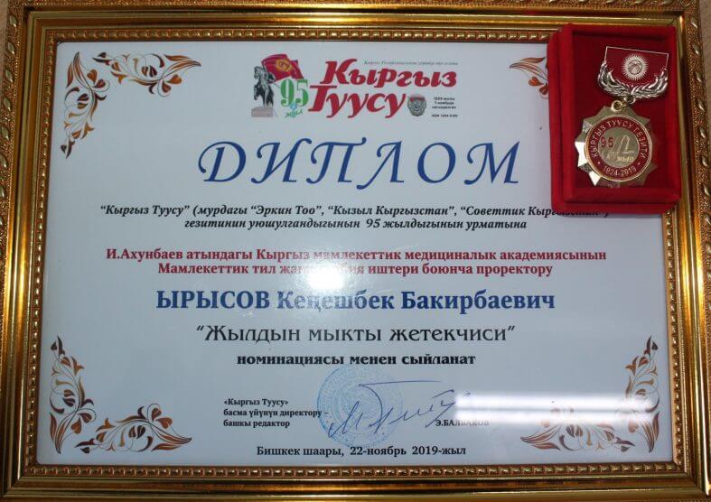 Vice-rector of the KSMA named after I.K. Akhunbaeva on the state language and educational work, Professor Keneshbek Yrysov was named “the best leader of the year” according to the republican newspaper “Kyrgyz Tuusu”. He was awarded a diploma and an editorial badge. The vice-rector was warmly congratulated on the next award by the heads of the university, as well as his colleagues and friends. Vice-rector of KSMA.