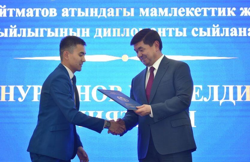 6th year student of the I.K. Akhunbaeva Baygeldi Nurdinov became a diploma winner of the State Youth Prize of the Kyrgyz Republic named after Ch.T. Aitmatov in the nomination "The best work in the field of science and new technologies." The high award was presented to the student, along with other awardees, by the Prime Minister of the country Mukambetkaly Abylgaziev on December 12, 2019.