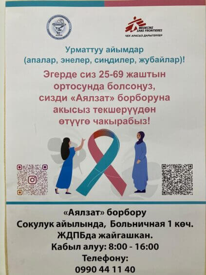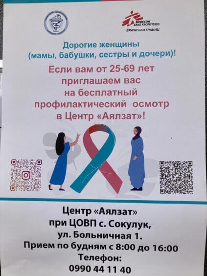 For several years, “ Medecin Sans Frontieres” Kyrgyzstan has been implementing a pilot project on women's health care in Sokuluk district. Under the project, a breast and cervical cancer screening centre was opened in Sokuluk District Hospital in joint cooperation with the Ministry of Health.