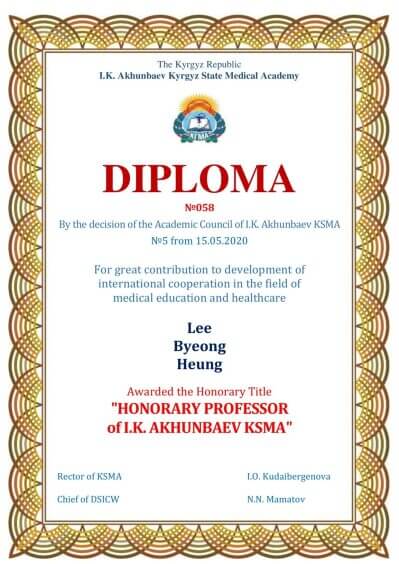 On August 28, 2020, Director of the International Science Institute of Asia U.S. FDA, Chairman of the Board of Directors of LCM Korea Co., Ltd; LCM Science Co., Ltd and Thelma Therapeutics Co., Ltd. Lee Byeong Heung was awarded the high title of "HONORARY PROFESSOR of I.K. AKHUNBAEV KSMA" for achievements in the field of international cooperation in medical education and health care.