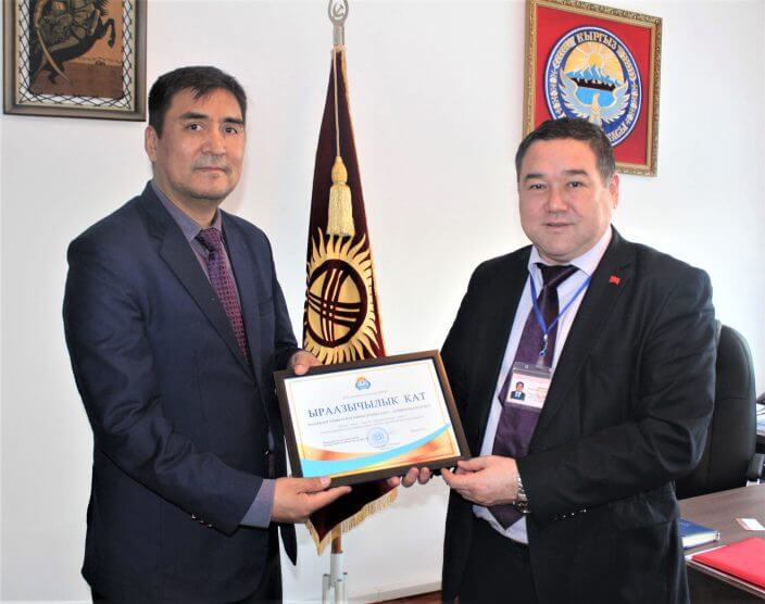 On January 9, 2020, vice-rector of the I.K. Akhunbayev on the state language and educational work, Professor Keneshbek Yrysov presented professor of Nazarbayev University (Kazakhstan) Duyshonkul Shamatov with a "letter of thanks" on behalf of the university administration. He was awarded this honor for supporting the work of the scientific and theoretical conference "Epos" Manas "- bardyk ilimderdin bulagy" ("Epos" Manas "- the source of all sciences), organized at the KSMA.