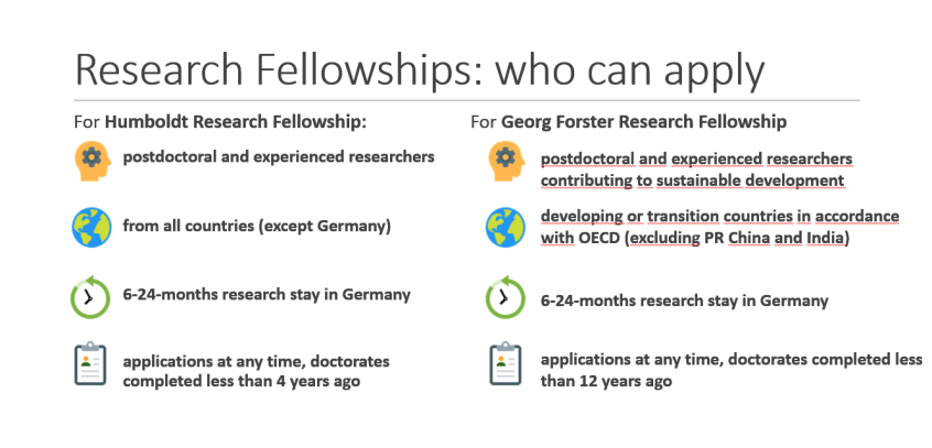 - Humboldt Research Fellowship for researchers of all nationalities and research areas: We support you – postdoctoral and experienced researchers – with your research in Germany. Through the Humboldt Research Fellowship, the Alexander von Humboldt Foundation sponsors researchers with above-average qualifications from across the globe. As a fellow, you will benefit from individual support from the Humboldt Foundation and our diverse sponsorship portfolio.