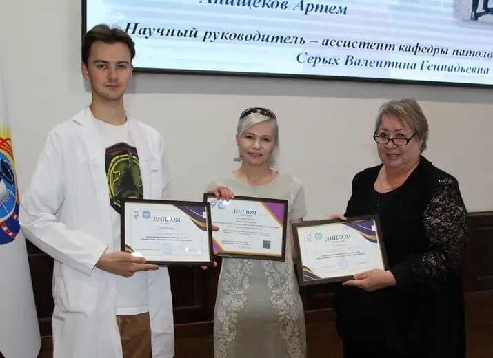 Ректор КГМА профессор Кудайбергенова И.О. вручает дипломы за победу в Международной олимпиаде студенту 3 курса лечебного факультета Анищенко Артёму и руководителю СНК «Патолог» Серых В.Г. (2023 г).