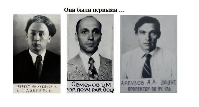 По архивным материалам, к сожаленью, удалось восстановить фото не всех руководителей по учебной работе и в свое время эти должности исполняли Данияров С.Б., доцент Семенов Б.М., доцент Арбузов и др.