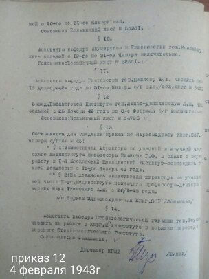 - 1: Заместителя директора по учебной части КГМИ профессора Иванова Г.Ф. в связи с переводом на работу в I-й Московский медицинский институт – освободить от занимаемой должности с 12 января 1943гю