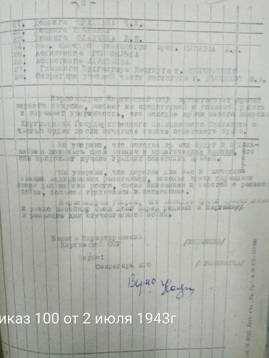 В конце приказа № 100 от 2 июля 43г обращение Наркомздрава к первому выпуску врачей КГМИ: