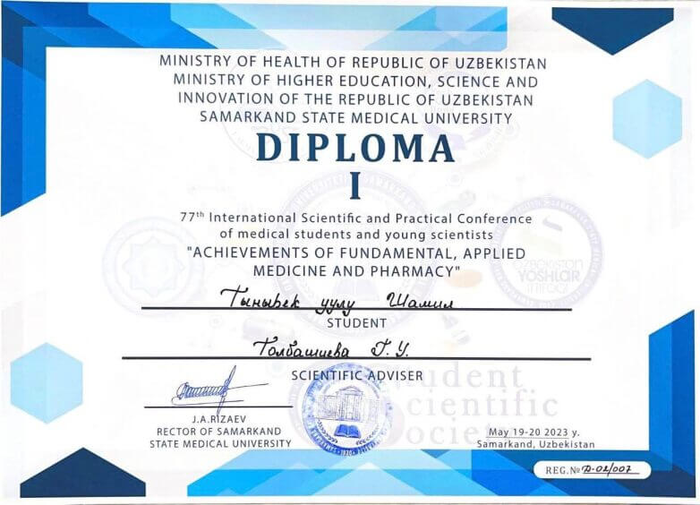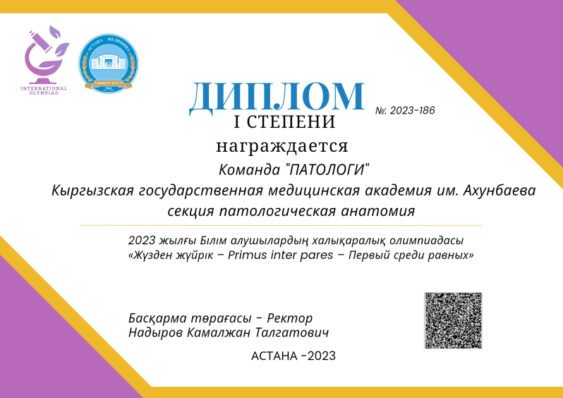 Мирланова Жанат Мирлановна удостоена дипломом 1 -й степени по топографической анатомии