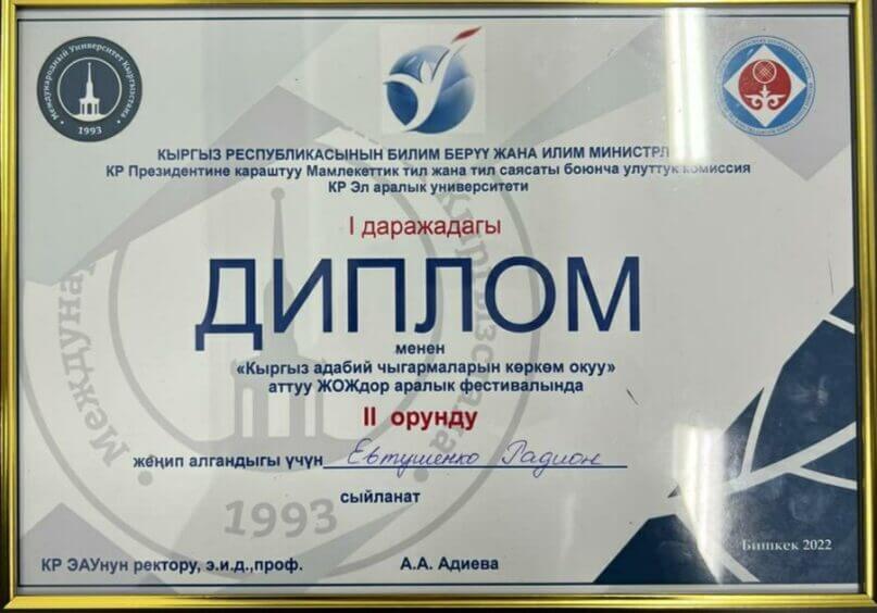Евтушенко Радион, студент 1 курса факультета "Лечебное дело №1", занял второе место на фестивале «Художественное чтение кыргызских литературных произведений».