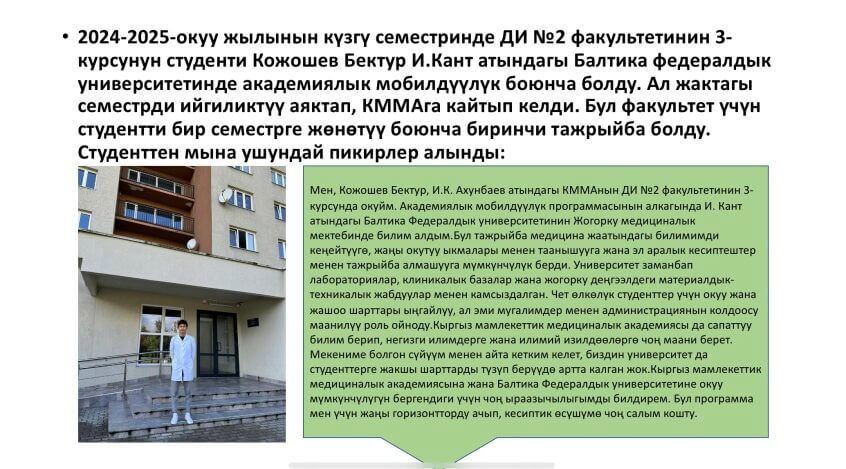 4 декабря 2023 года, в КГМА им. . И.К. Ахунбаева совместно с кафедрой философии и общественных наук студенты 2-го курса выступили с докладом ко День Манаса