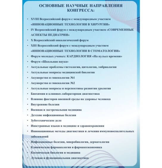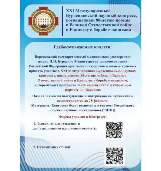 В Воронежском государственном медицинском университете им. Н.Н. Бурденко 24-26 апреля 2025 года состоится XXI Международный Бурденковский научный конгресс, посвященный 80-летию победы в Великой Отечественной войне и Единству в борьбе с нацизмом (далее — Конгресс). В рамках Конгресса будет проходить Международный Англоязычный Форум «Medicine without frontiers». Мероприятие будет проходить в гибридном формате: очное участие с применением дистанционных платформ.