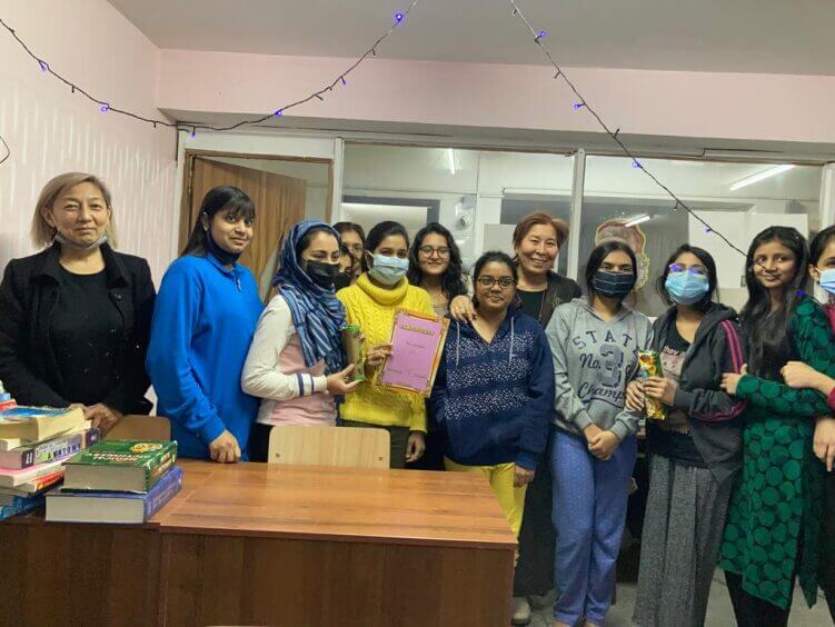 В преддверии нового года старший куратор 7-8 общежития Чолпон Усупова и коменданты Улукбекова Гульбубу Азизбековна, Иминова Дамира Рахмоновна провели награждение сертификатами и сладкими призами по номинациям – «самая чистая комната», «самый чистый этаж», «самый дисциплинированный студент и студентка».