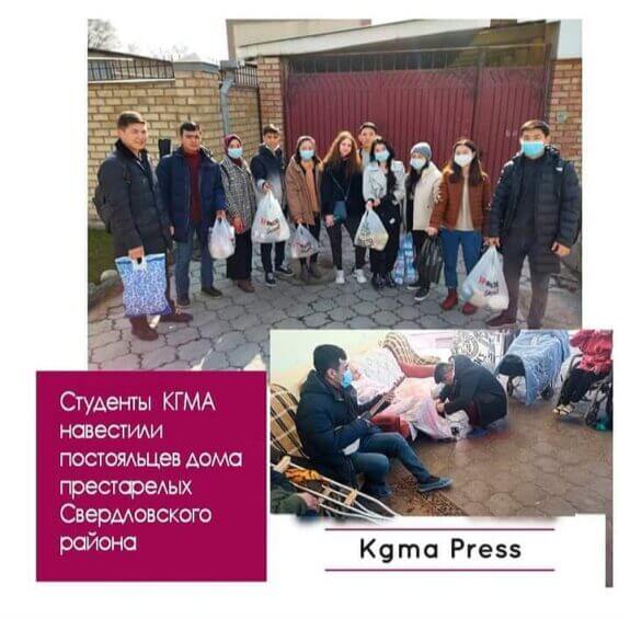 Проведена благотворительная акция , направленная на сбор пожертвований для дома-интерната престарелых г.Бишкек. В рамках акции были проведены: Благотворительная ярмарка, субботник в доме-интернат. Наряду с воспитательным отделом и студентами дом-интернат престарелых посетила ректор КГМА им.И.К.Ахунбаева. Студенты отнесли одежды, памперсы и организовали горячий домашний обед.