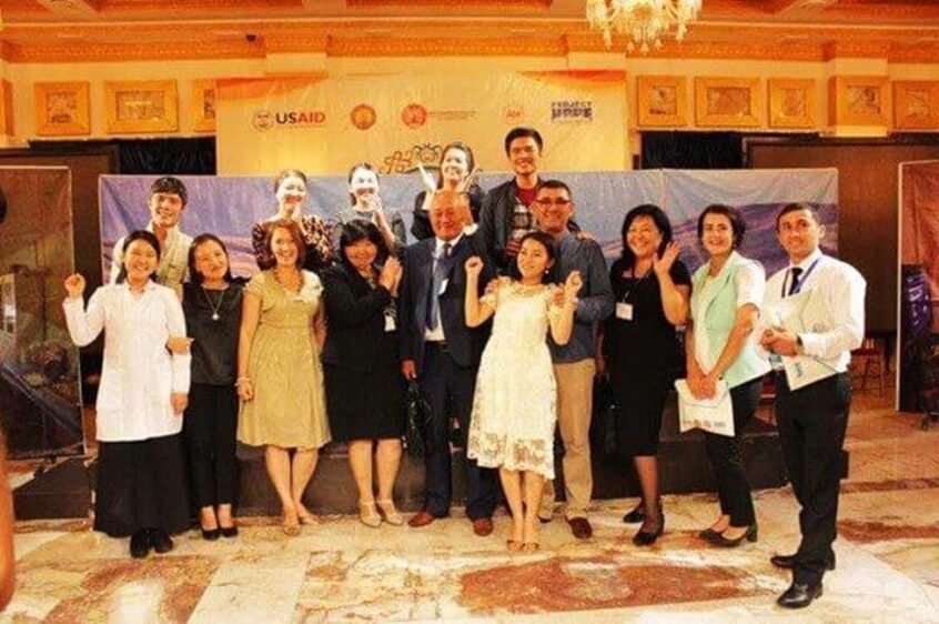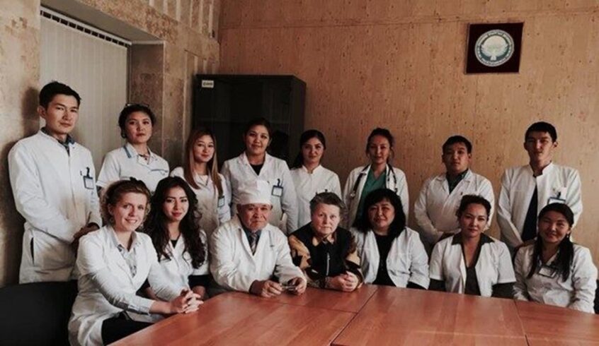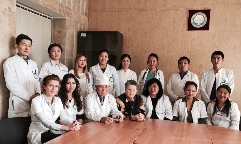 Сүрөт 11. Ортодо профессор м.и.д., Кадыров А.С. жана м.и.к. Турдумамбетова Г.К., КГМАнын дарылоо иши факультеттинин 5 курс студенттери менен