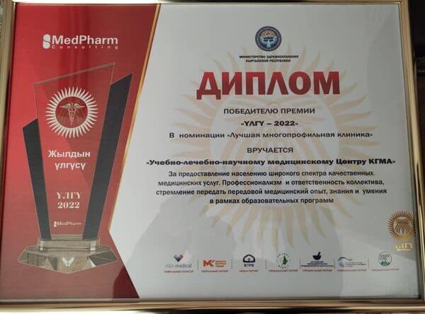 КММАнын окуу-дарылоо-илимий медициналык борбору коллективдин кесипкөйлүгү жана жоопкерчилиги, билим берүү программаларынын алкагында алдыңкы медициналык тажрыйбаны, билимди жана көндүмдөрдү өткөрүп берүүгө умтулуусу, калкка сапаттуу медициналык кызматтардын кеңири спектрин көрсөткөндүгү үчүн «Үлгү-2022» сыйлыгынын жеңүүчүсү болду.