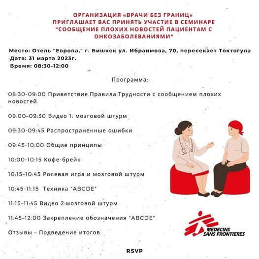 Кечээ жакында, И.К.Ахунбаев атындагы КММАнын онкология бөлүмүнүн кызматкерлери Азамат Кылчыкбаев жана Юлия Ситникова MSF тин аялдардын ден соолугуна арналган долбоорунун «Рак менен ооруган бейтаптарга жаман кабарды билдирүү» аттуу семинарына катышты.