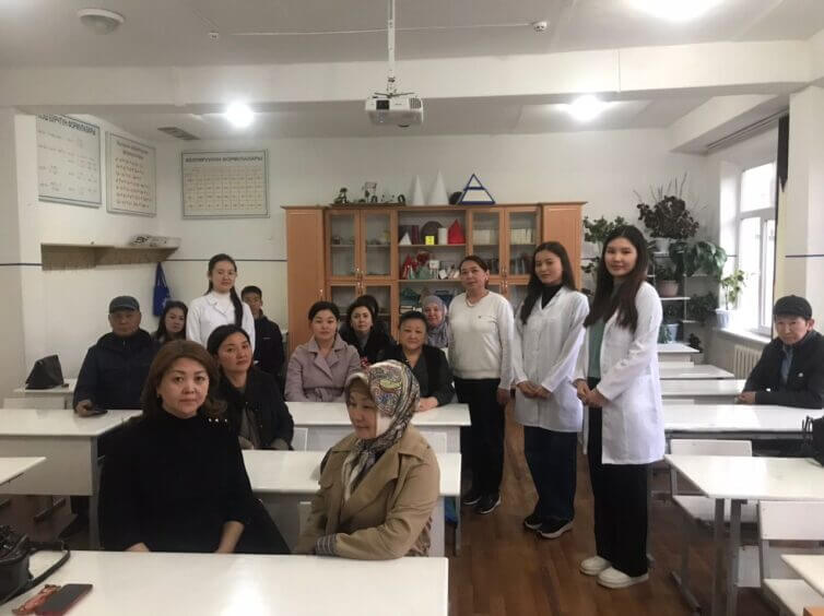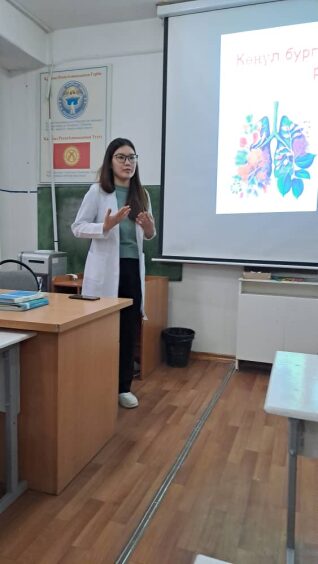 Жалпы гигиена кафедрасынын ассистенти Байбосова Чынара Кубанычбековна И.К.Ахунбаев атындагы КММАнын «Даарылоо иши 2» факультетинин, 36-тайпасынын студенттери Кадырова С., Телманова А., Аккулова Г. менен жалпы гигиена кафедрасынын бөлүм башчысы А.А. Джорбаеванын өтүнүчү менен ОТКГда "Жугуштуу оорулар жана анын ичинде кургак учук" деген темада окуучулардын ата-энелерине терең маалымат берип, слайд түрүндө доклад окушту.