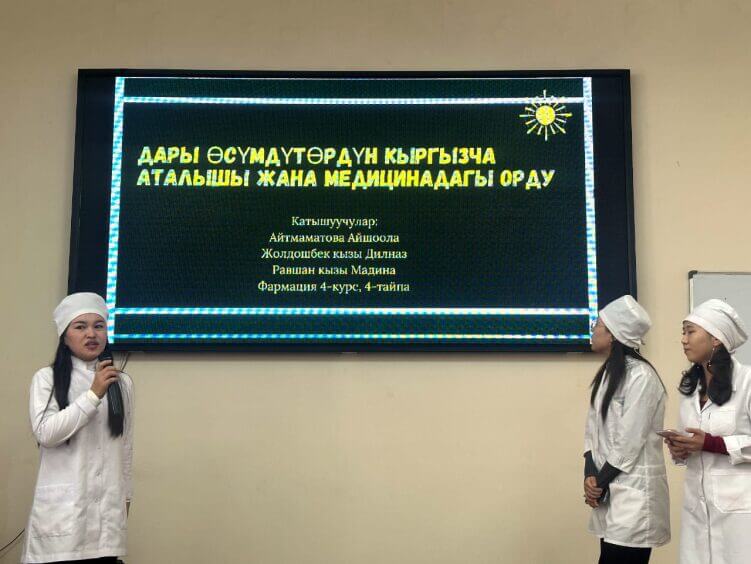 4-Курсунун студенттери фармакогнозия сабагынан Кыргызстандын Кызыл китебинен орун алган дары ѳсүмдүктѳрүнүн аталышын, ѳзгѳчѳлүктѳрүн, химиялык курамын, колдонулушун кыргыз тилинде мазмундуу түрдѳ айтып беришип, дары ѳсүмдүктѳрүнүн түстүү сүрѳттѳрү кѳрсѳтүлүп, алардын фармациядагы орду жана келип чыккан уламыштар менен толукталып, бардык катышуучуларга ѳтѳ кызыктуу маалымат бере алышты. Аягында “Кѳчмѳндѳр” күүсү, “Кызыл ѳрүк” ыры аткарылып, улуттук бийлер менен коштолду.