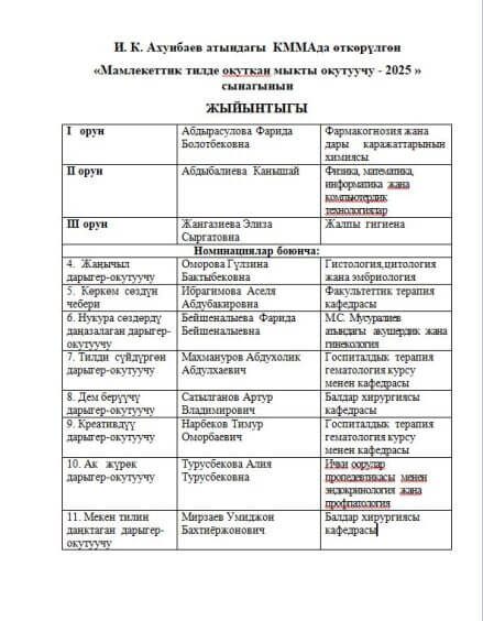 Мамлекеттик тилдин деңгээлин көтөрүү максатында уюштурулган сынакты ректор И. О. Кудайбергенова чын дилден колдоп,баалуу сыйлыктарды коюп берди.Сынактын жыйынтыгында I орунду фармакогнозия жана дары каражаттарынын химиясы кафедрасынын окутуучусу Абдырасулова Фарида Болотбековна ээлеп, ноутбук, ал эми II орунга физика, математика, информатика жана компьютердик технологиялар кафедрасынын доценти Абдыбалиева Канышай көрсөтүлүп, планшет, ошондой эле жалпы гигиена кафедрасынын окутуучусу Жангазиева Элиза Сыргатовна III орунду ээлеп, уюлдук телефон менен сыйланышты.