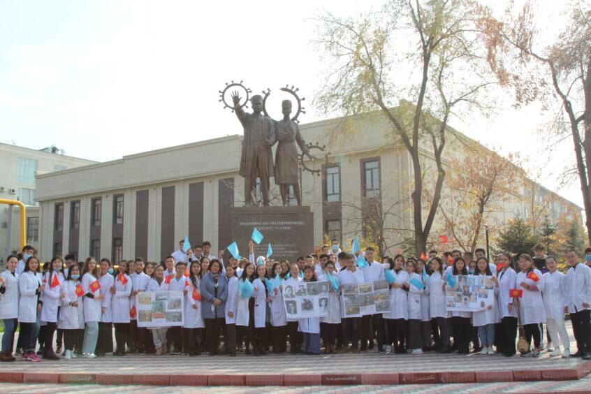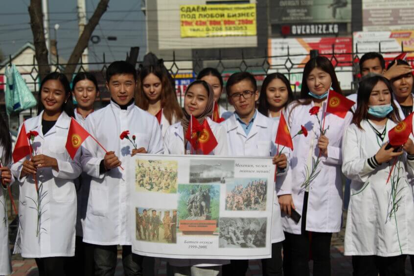 Иш-чарада студенттер И.А.Ахунбаев жана пандемияда курман болгондордун элесине арналган эстеликтерге гул коюшуп чакан концерт уюштурушту.