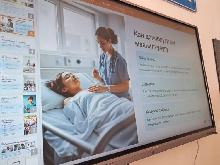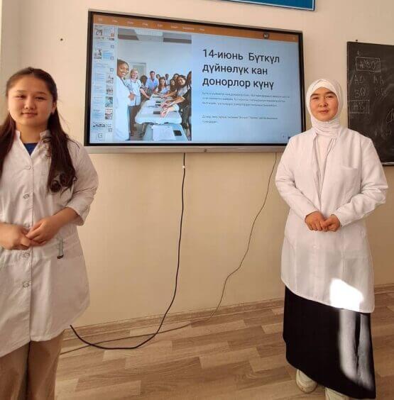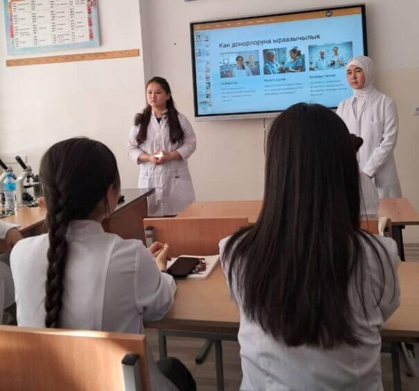 Иш чаран жүрүшүндө студенттер кан донорлугунун тарыхы, маанилүүлүгү, коюлуучу талаптары, пайдалуулугу жөнүндө кенен маалымат алып, азыркы учурдагы кан донорлугу тууралуу маек курушту.