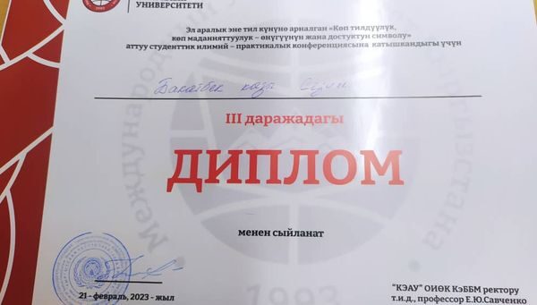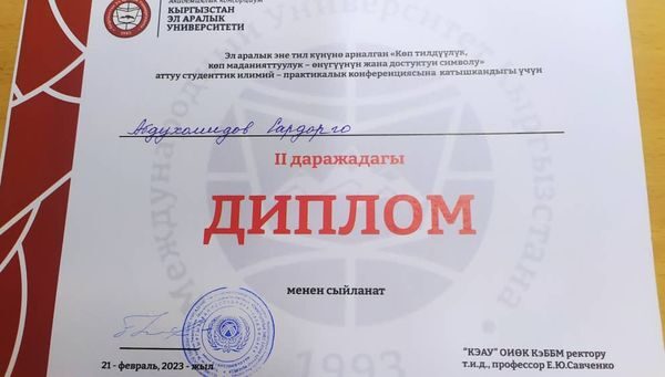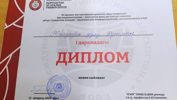 2023-жылдын 21-февралында Кыргызстан эл аралык университети тарабынан уюштурулган «Көп тилдүүлүк, көп маданияттуулук – өнүгүүнүн жана достуктун символу» аттуу ЖОЖдор аралык студенттердин илимий-тажрыйбалык конференциясына И.К.Ахунбаев атындагы КММАнын кыргыз тили кафедрасынын окутуучулары жетектеп барган 1-2-курстардын студенттери мыкты баяндамалар менен чыгып, байгелүү орундарга ээ болушту.