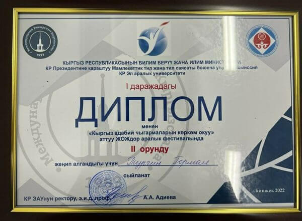 Фестивалга И.К.Ахунбаев атындагы КММАнын кыргыз тили кафедрасы жетектеп барган студенттери Випин – окутуу англис тилинде жүргүзүлгөн дарылоо иши факультети, 6-курс, Евтушенко Родион – №1 дарылоо иши факультети 1-курс, Турчин Герман – №2 дарылоо иши факультети 1-курс. Катышкан студенттер 11 жогорку окуу жайларынын арасынан 2-орунду багындырышып, дипломдор жана баалуу белектер менен сыйланып келишти. Даярдап баргандар кыргыз тили кафедрасынын башчысы п.и.к., доцент Абдырасулова Э.К. жана окутуучу Анарбаева Ж.К.