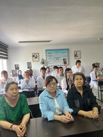 Иш чарага кафедранын башчысы профессор м.а. Ч.С. Усупова жана кафедранын доценттери Акматова Н.С, Сатыбалдиева Р.А. катышты. Ачык сабакта согуштун тарыхый окуялары менен чагылдырылган слайд көрсөтүлдү, Кыргызстандыктардын жеңишке кошкон салымы, ССР – элдеринин жана өнөр жайлардын, медицина эвакуациясы чагылдырылды.