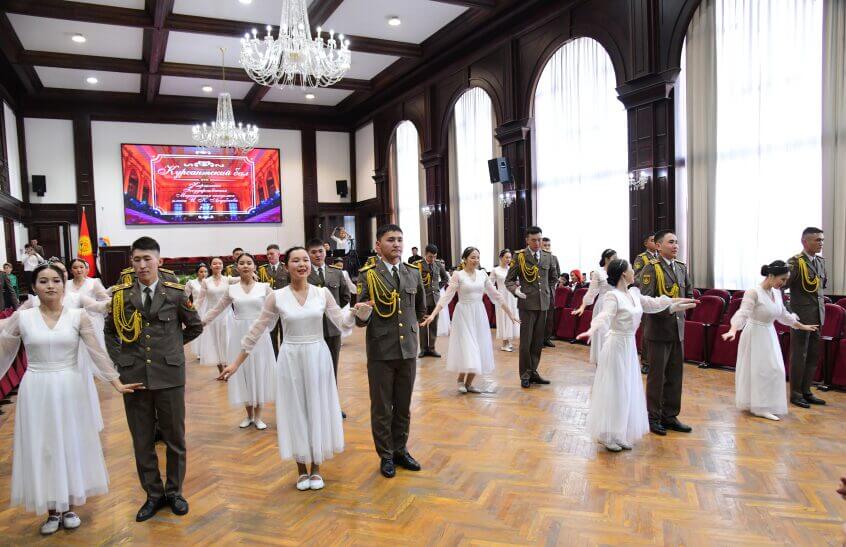 Кыргыз Республикасынын Куралдуу Күчтөрүнүн Советтер Союзунун Баатыры генерал-лейтенант К.Үсөнбеков атындагы Аскер институтунун курсанттары жана И.Ахунбаев атындагы КММАнын студенттери вальс бийин алып чыгышты.