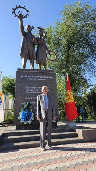 Профессор Оморов Р.А. у памятника врачам, боровшихся с COVID-19