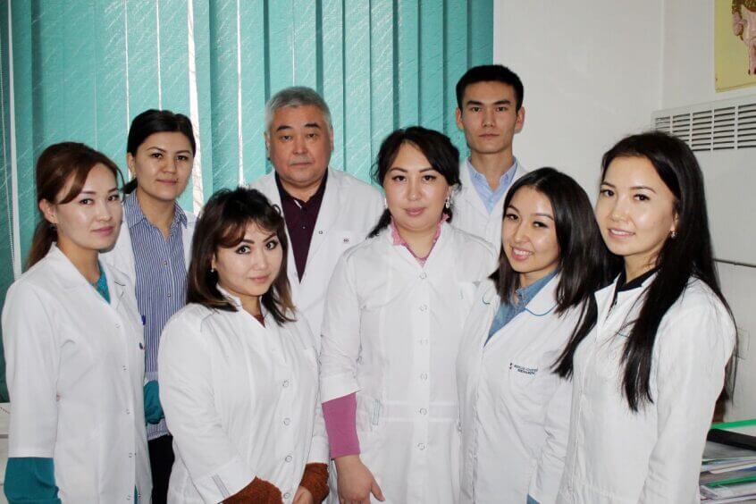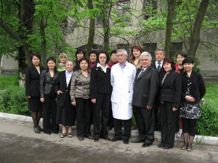 На фото сотрудники курса гематологии совместно с зав.кафедрой, слева направо: ассистенты Алымова А.Б., Садабаев Э.М., к.м.н. Эралиева М.О., к.м.н., доцент Джакыпбаев О.А. (зав.курсом), Топчубаева А.Б., д.м.н., зав.каф., д.м.н. Маматов С.М., к.м.н. Махмануров А.А.