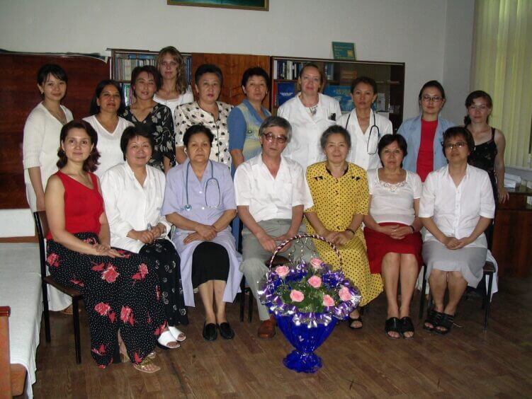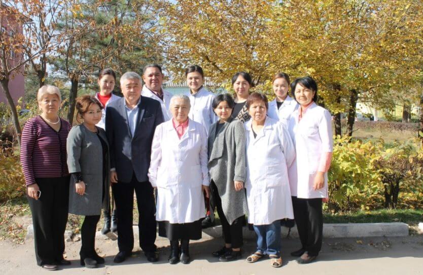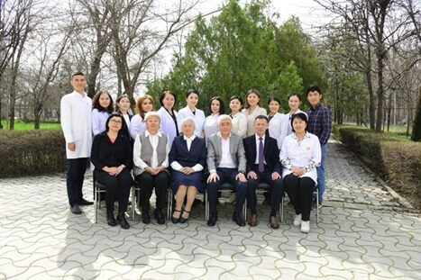 Фото сотрудников кафедры госпитальной терапии (ГКБ№1), слева направо: ст.лаб. Мокеева З.Б., Атабаева Д.Н., Садыкбек кызы Асель, д.м.н. Маматов С.М. (зав.каф.), к.м.н. Махмануров А.А., доцент Курумшиева А.Ш., Арстанбекова М.А., Джуиашалиева Ч.С., Иманалиева Ф.Э., доцент Мергенбаева Т.К., Канат кызы Базира, Джаныбекова С.А.