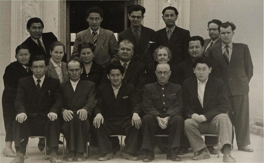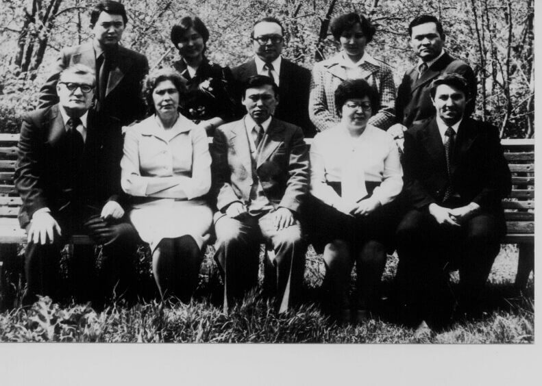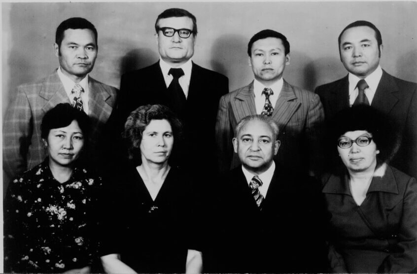 Фото 7. Зав. кафедрой туберкулеза КГМИ Фукс П.М. со своими сотрудниками: с верхнего ряда слева направо: ассистенты Субанбеков М.Д., Третьяков А.С., Асамбаев А.А., Кашенов Т.К., старший лаборант Узакбаева О., ассистент Зубарева В.Я., зав. кафедрой Фукс П.М., ассистент Исхакова М.А.
