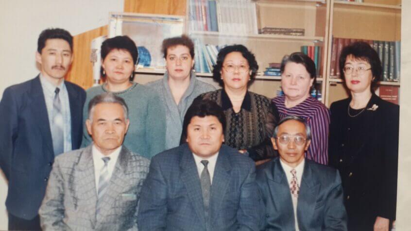 Фото 10 (справа налево). Проф., д.м.н. Чубаков Т.Ч., зав. кафедрой фтизиатрии д.м.н. Алишеров А.Ш., доц. Субанбеков М.Д., доц. Галиева Р.Ш., ст. лаборант Колесникова З.С., к.м.н. Азыкова А.Б., асс. Федорова С.В., к.м.н. Душимбекова К.А., асс. Маматов К.Р.(1996г.)