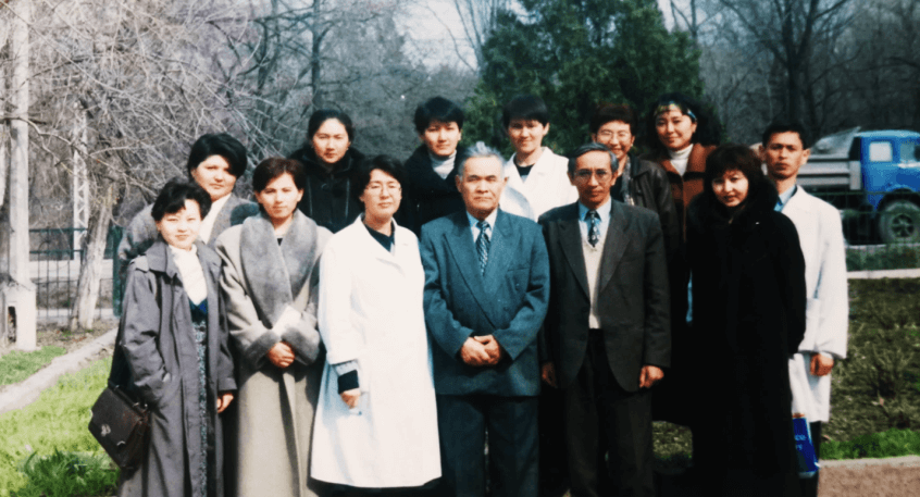 Фото 11. Проф. Чубаков Т.Ч., доц. Субанбеков М. Д., доц. Галиева Р.Ш. с клиническими ординаторами-фтизиатрами (1998 г.)