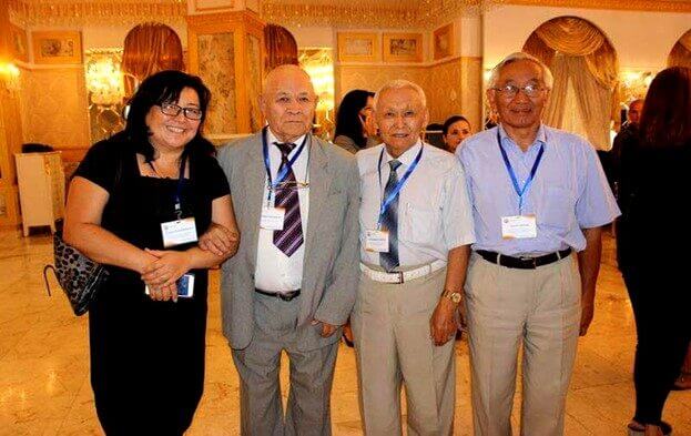 Фото 17. Зав.кафедрой фтизиатрии КГМА со своими учителями: заслуженным врачом КР, старейшим фтизиопедиатром, доц. Субанбековым М.Д., заслуженным врачом КР, почетным проф.КГМА, доц.Асамбаевым А.А. и ректором КГМИПиПК, проф.Чубаковым Т.Ч. на международной конференции (2018г.)