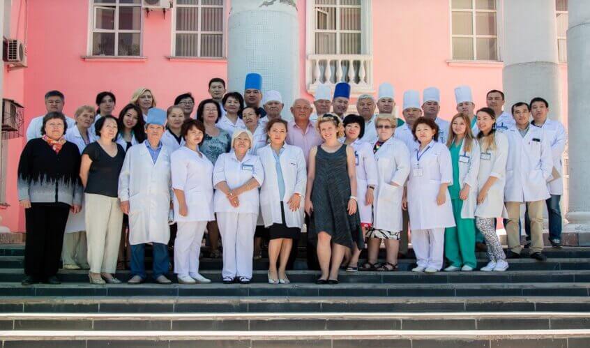 Фото 16 (слева направо). Асс. Гончарова О.С., завуч Ахметова Р.Х., доц., заслуженный врач Субанбеков М.Д., ст. лаб. Колесникова З.С., зав. кафедрой Турдумамбетова Г.К., асс. Байтелиева А.К., асс. Омуралиева Г.О. и клин. ор. по специальности «фтизиатрия».