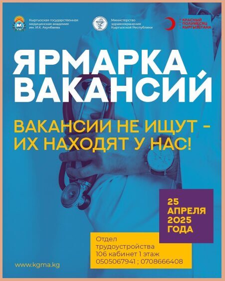 Уважаемые студенты 6 курса , врачи-интерны, ординаторы и выпускники КГМА мы Вас ждём на «Ярмарке вакансий» которая состоится 25-апреля 2025 года в Конфренц Холле КГМА ул. Ахунбаева 92