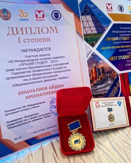 Студент 4 курса, факультета "Лечебное дело", Иманалиев Айдан, признан лучшим студентом СНГ-2021. Награжден нагрудной медалью "Лучший студент СНГ-2021", дипломом 1 степени, а также вошел в III-й сборник лучших студентов Международной студенческой книжной коллекции "Энциклопедия талантливой молодежи".