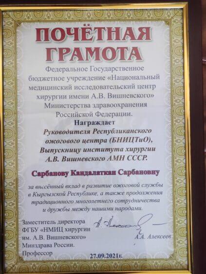 Доцент кафедры хирургии общей практики с курсом комбустиологии КГМА им.И.К.Ахунбаева, к.м.н Кандөөлөт Сарбанова была награждена Почетной грамотой Федерального Государственного бюджетного учреждения "Национальный медицинский исследовательский центр хирургии имени А.В.Вишневского" Министерства здравоохранения Российской Федерации за внесенный вклад в развитие ожоговой службы в Кыргызской Республике, а также продолжения традиционного многолетнего сотрудничества и дружбы между нашими странами.