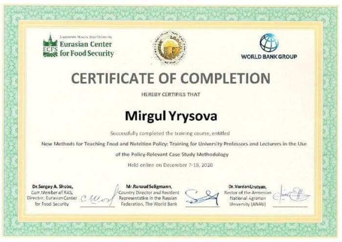 Доцент кафедры общей и клинической эпидемиологии КГМА имени И.К.Ахунбаева Миргуль Ырысова получила сертификат о прохождении онлайн-курса «Новые методы преподавания политики в области пищевых продуктов и питания: обучение профессоров и преподавателей университетов использованию актуальной для политики методологии тематического исследования».