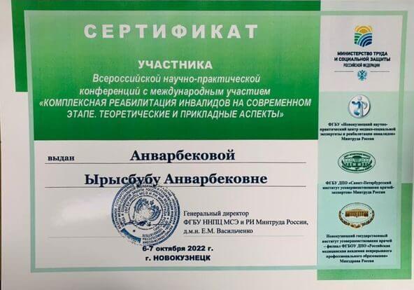 Кандидат медицинских наук, доцент кафедры клинической реабилитологии и физиотерапии КГМА им.И.К.Ахунбаева Ырысбүбү Анварбекова выступила с докладом на Всероссийской научно-практической конференции с международным участием «Комплексная реабилитация инвалидов на современном этапе. Теоретические и прикладные аспекты» проходила в октябре 2022 года на базе ФГБУ «Новокузнецкий научно-практический центр медико-социальной экспертизы и реабилитации инвалидов» Министерства труда и социальной защиты Российской Федерации. На конференции обсуждались вопросы формирования и развития системы комплексной реабилитации и абилитации инвалидов и детей-инвалидов, в том числе её современные правовые, организационные, методологические и методические аспекты.