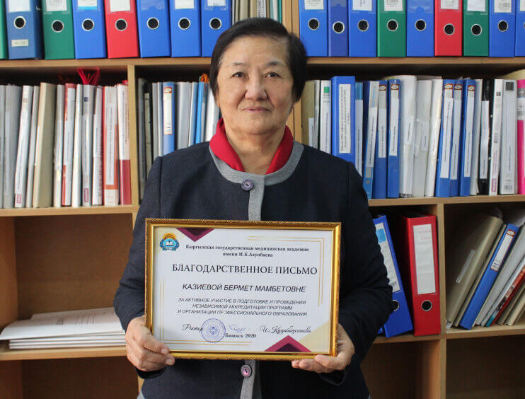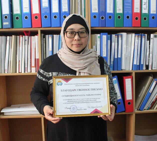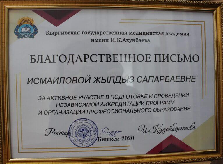 На днях некоторым сотрудникам Медакадемии Кыргызстана имени И.К. Ахунбаева были вручены благодарственные письма ректора вуза за активное участие в подготовке и проведении независимой аккредитации программ и организации профессионального образования.