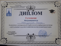 Студентка шестого курса КГМА имени И.К. Ахунбаева Даяна Нажмудинова заняла первое место, во второй межвузовской студенческой конференции “Актуальные задачи развития науки в Кыргызстане”. Конференция с участием ведущих вузов страны проходила в восьми направлениях: актуальные вопросы в сфере экономики, юриспруденции, политологии, психологии, естественнонаучного познания, а также рассматривались современные методы преподавания, изучения иностранных языков и внедрение новых электронных технологий в обществе и государстве.