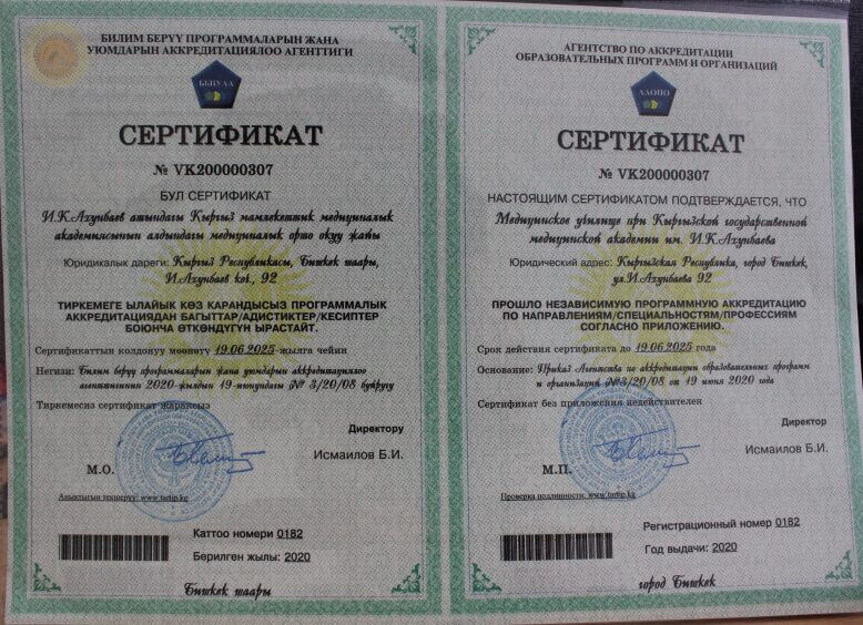 КГМА прошла институциональную аккредитацию в статусе высшего профессионального образования (специалист) и послевузовского профессионального образования (ординатура) до 19 июня 2025 года приказом Агентства по аккредитации образовательных программ и организаций (ААОПО). Прошло аккредитацию также медицинское училище при КГМА.